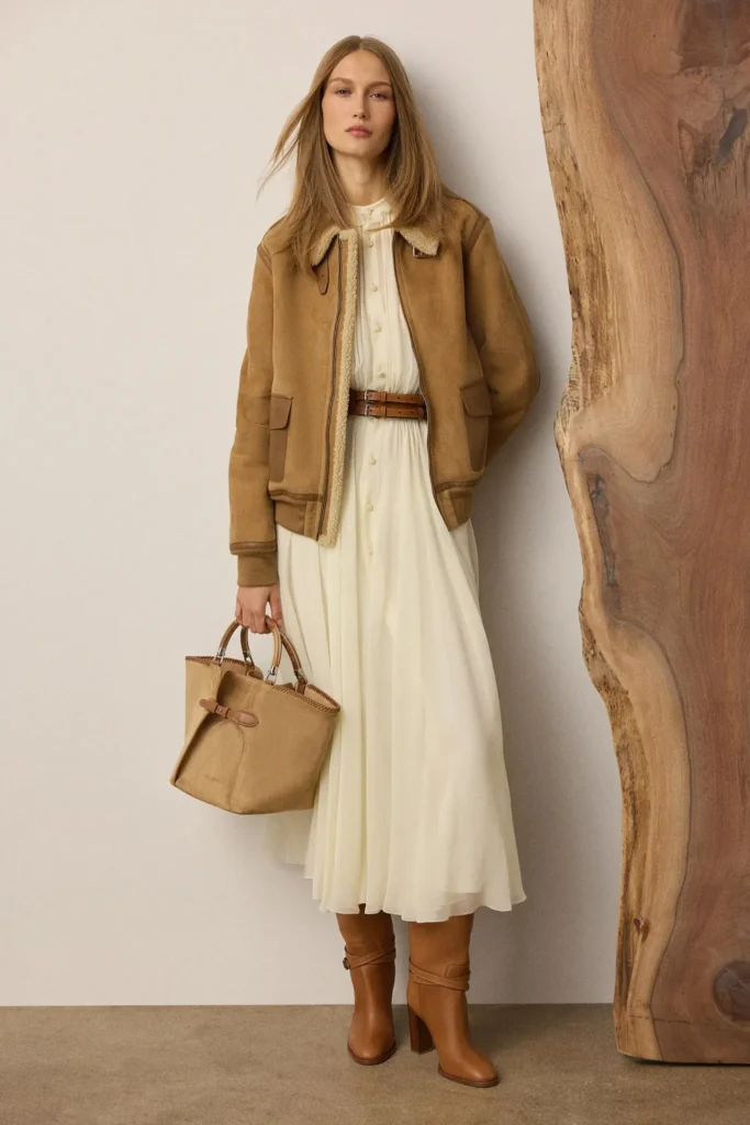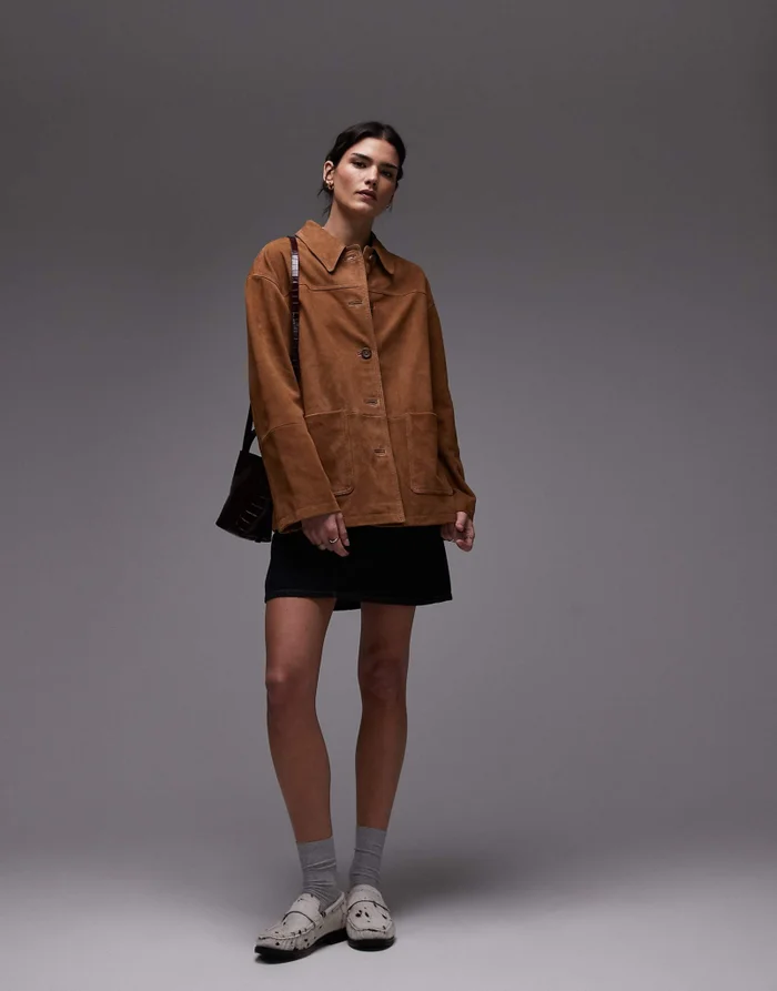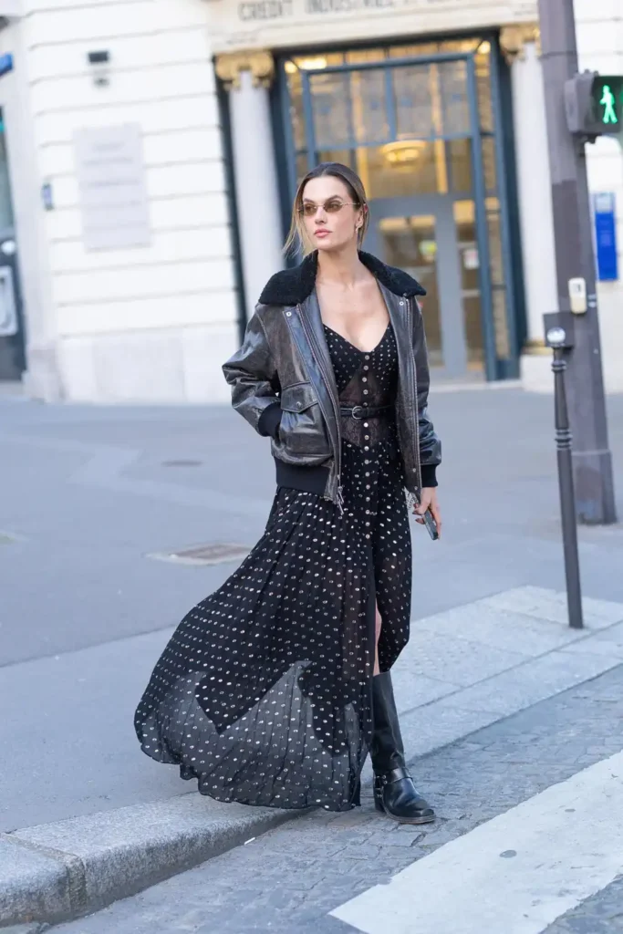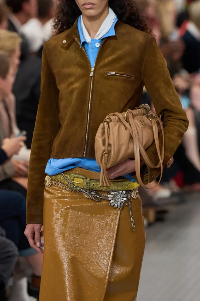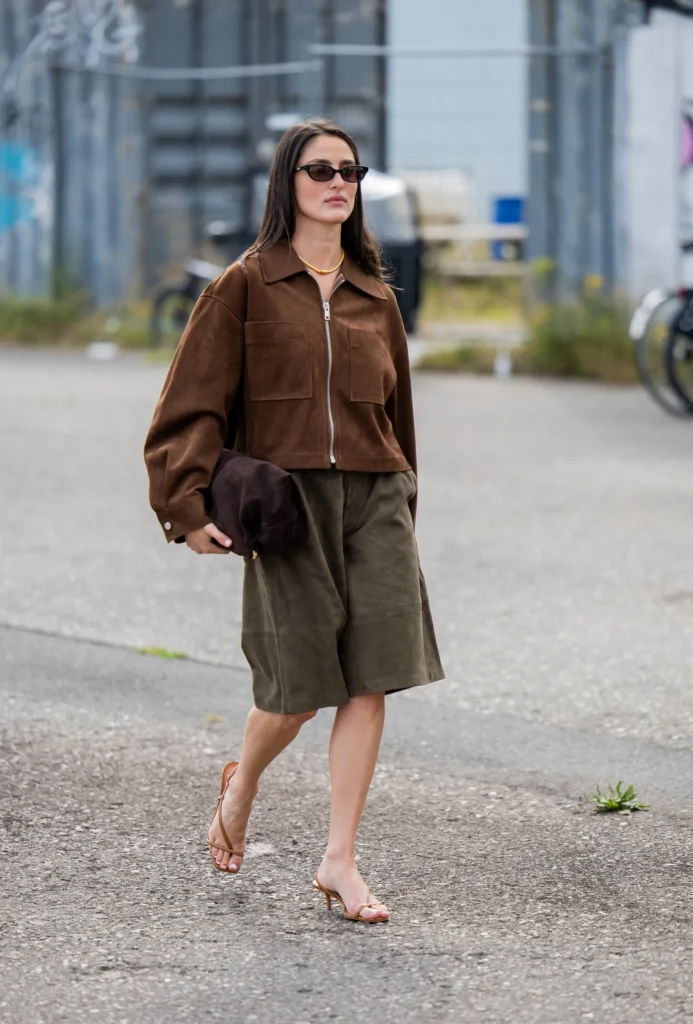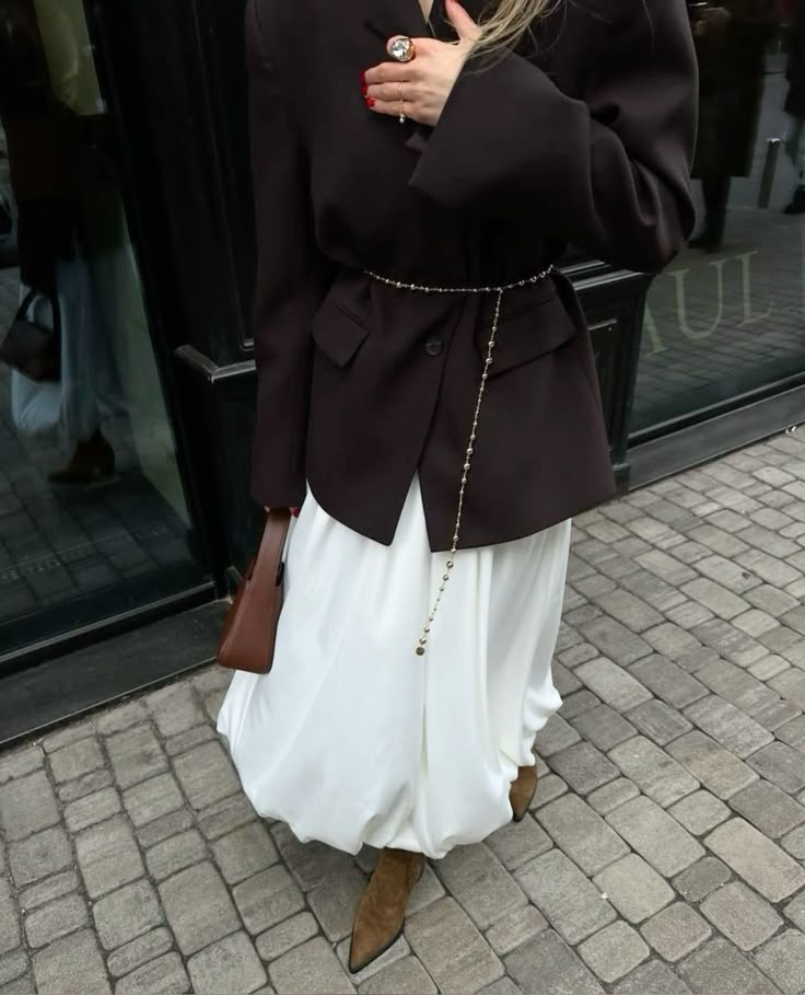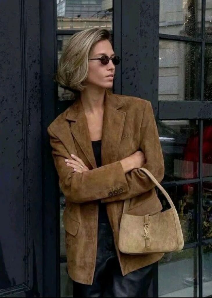 El ante reaparece otro invierno como textura icónica de la temporada: suave, flexible y visualmente acogedor. Se lleva en chaquetas, botas y bolsos, muchas veces acompañado por el color de la temporada: el marrón chocolate. Este tono oscuro y profundo desplaza al negro y ofrece una alternativa cálida, lujosa y menos predecible. Perfecto para trenchs largos, pantalones de cuero o minifaldas con medias opacas.