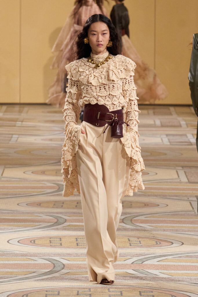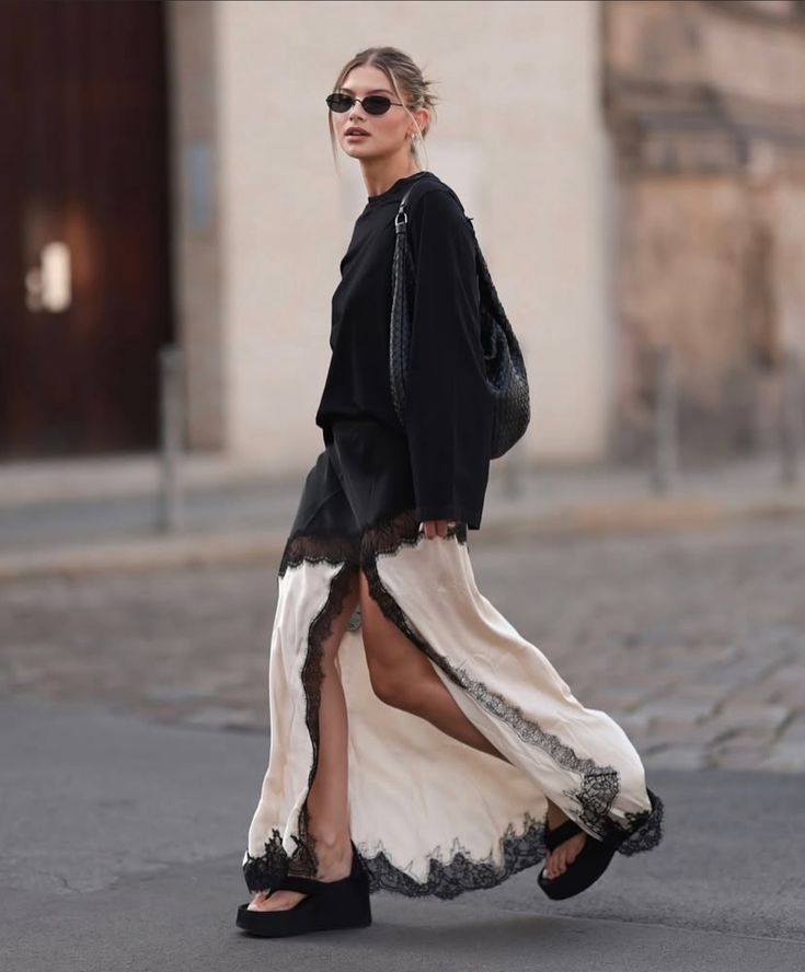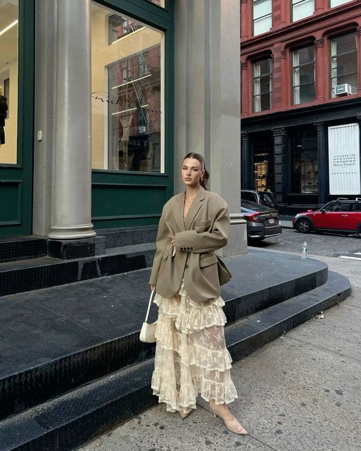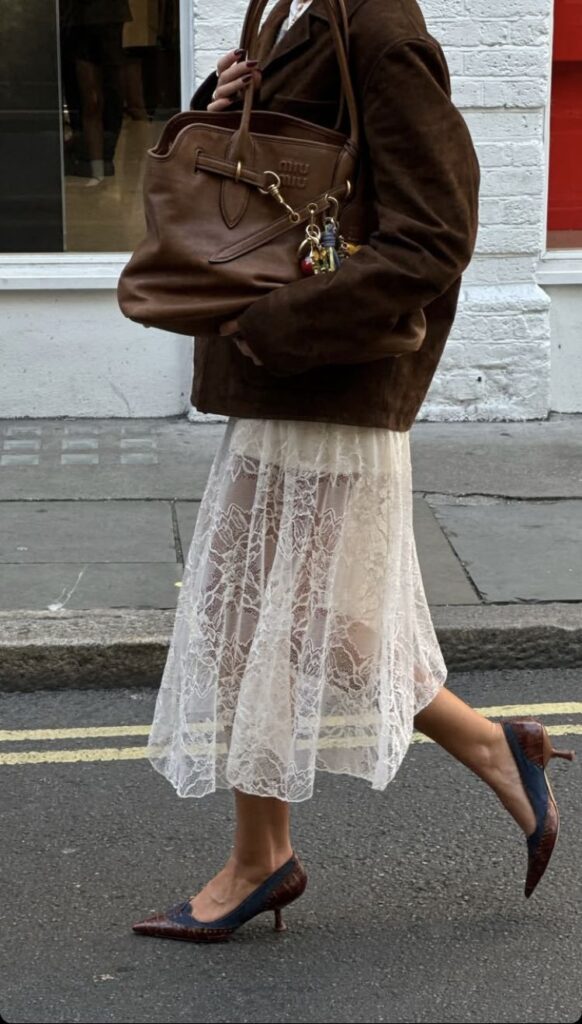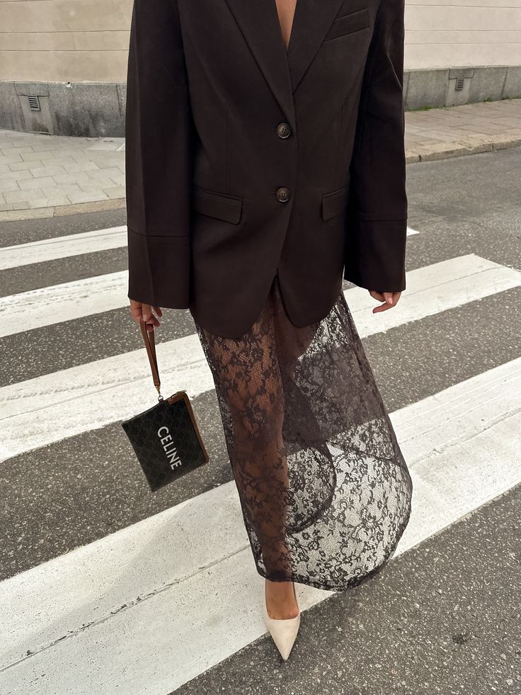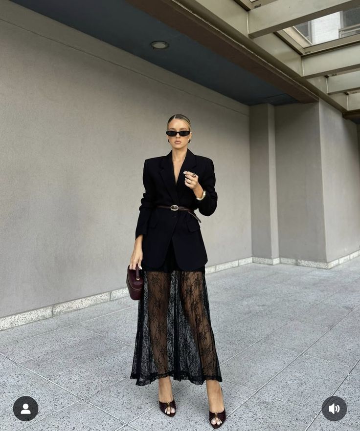 Esta temporada, el encaje sigue ocupando protagonismo en nuestros looks. Faldas semitransparentes, pantalones con aplicaciones de encaje y tops etéreos que mezclan delicadeza con fuerza visual. El nuevo romanticismo no es dulce: es sofisticado, adulto y estructurado. Ideal para looks de noche o para elevar un outfit de día con una blusa audaz bajo un blazer clásico.