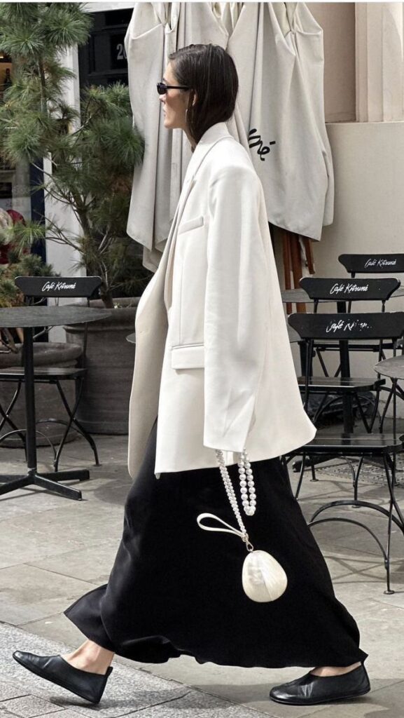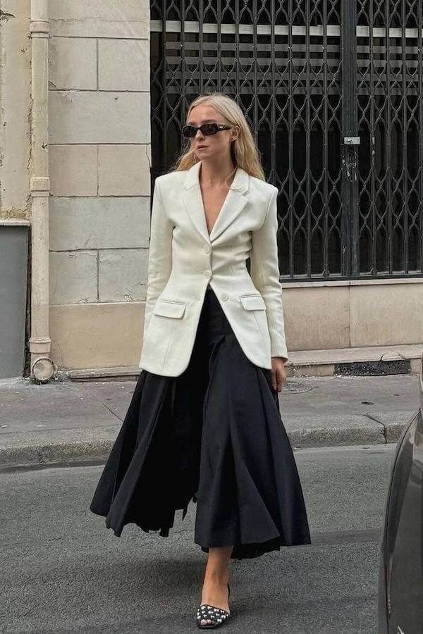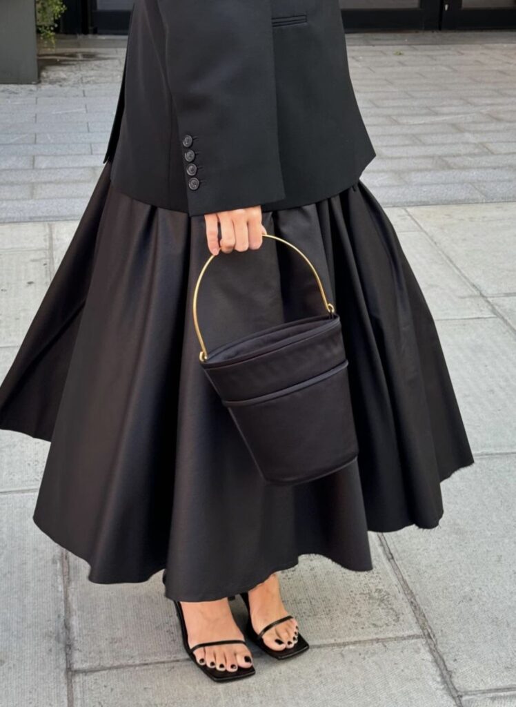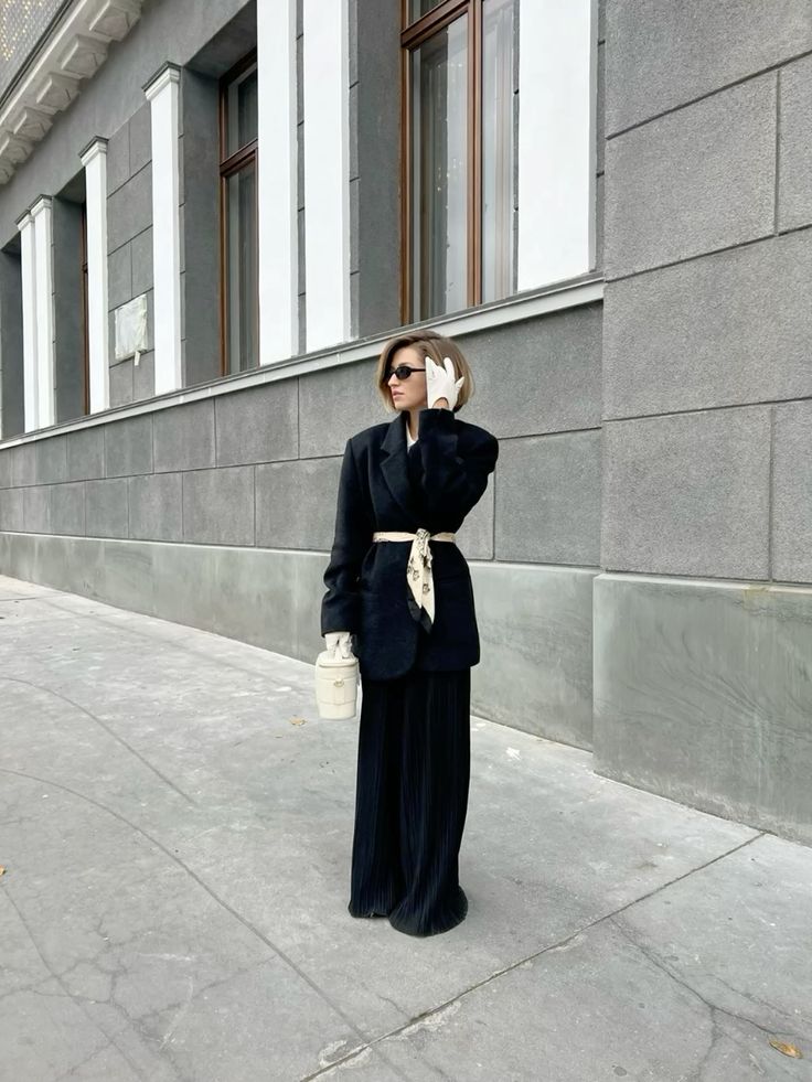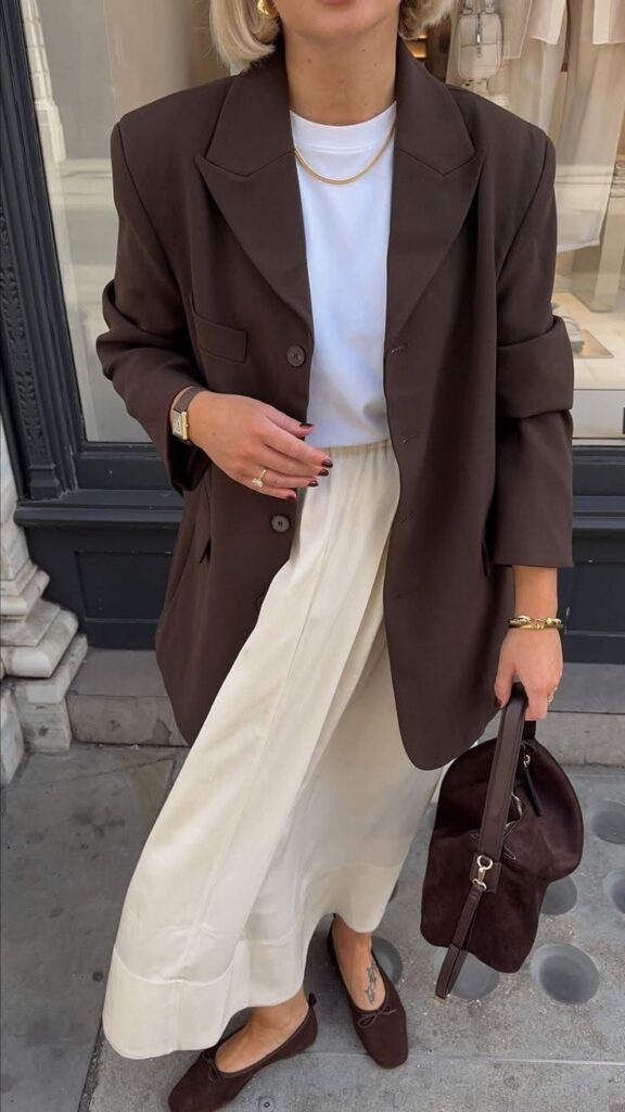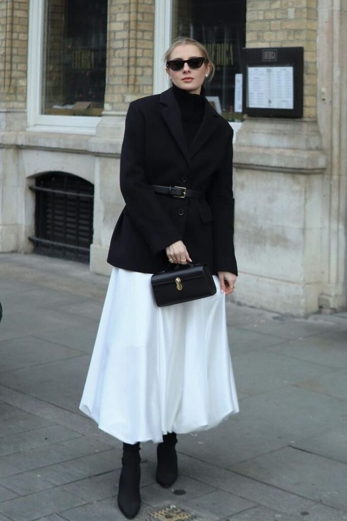 Las faldas midi —con vuelo, plisadas o rectas— reclaman protagonismo, acompañadas por prendas superiores voluminosas o ajustadas con cinturones. Los maxi abrigos y suéteres oversized construyen capas que abrazan, mientras el equilibrio entre volumen y estructura crea looks sofisticados y funcionales.