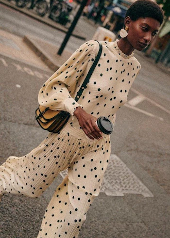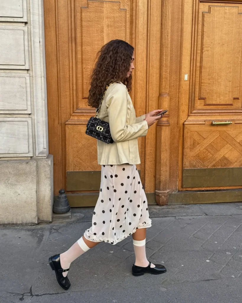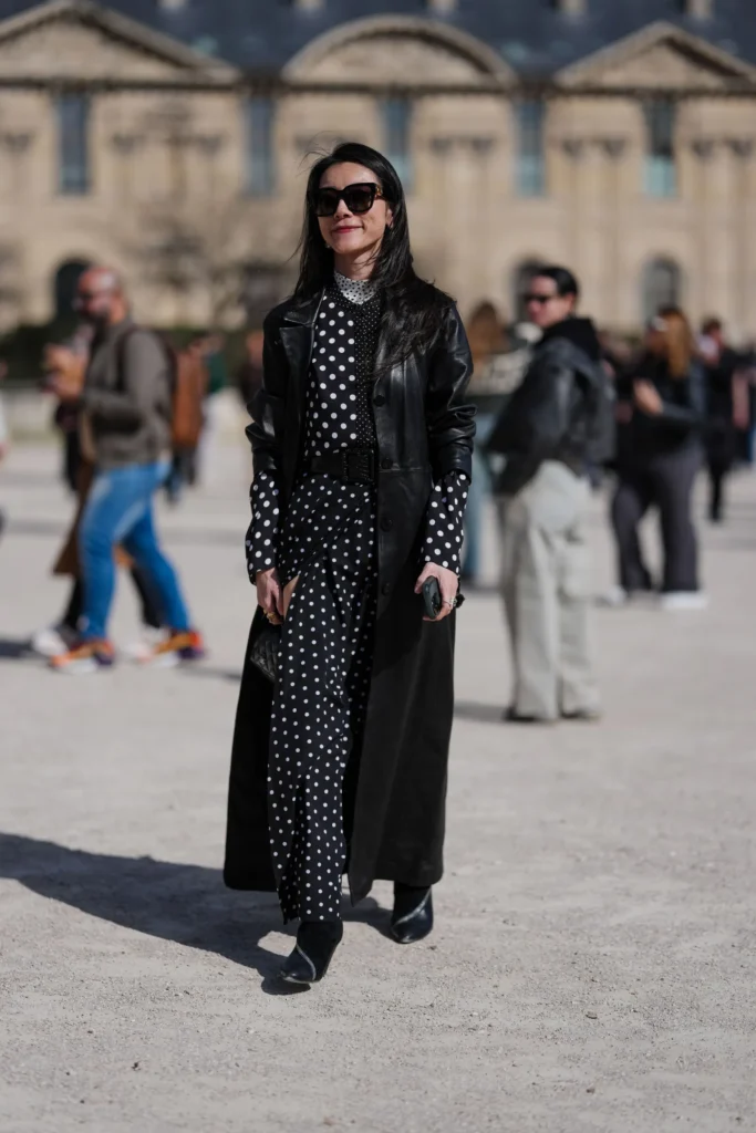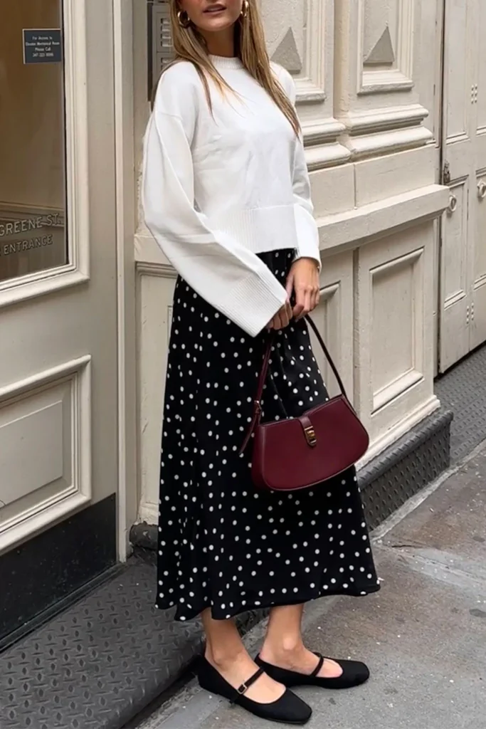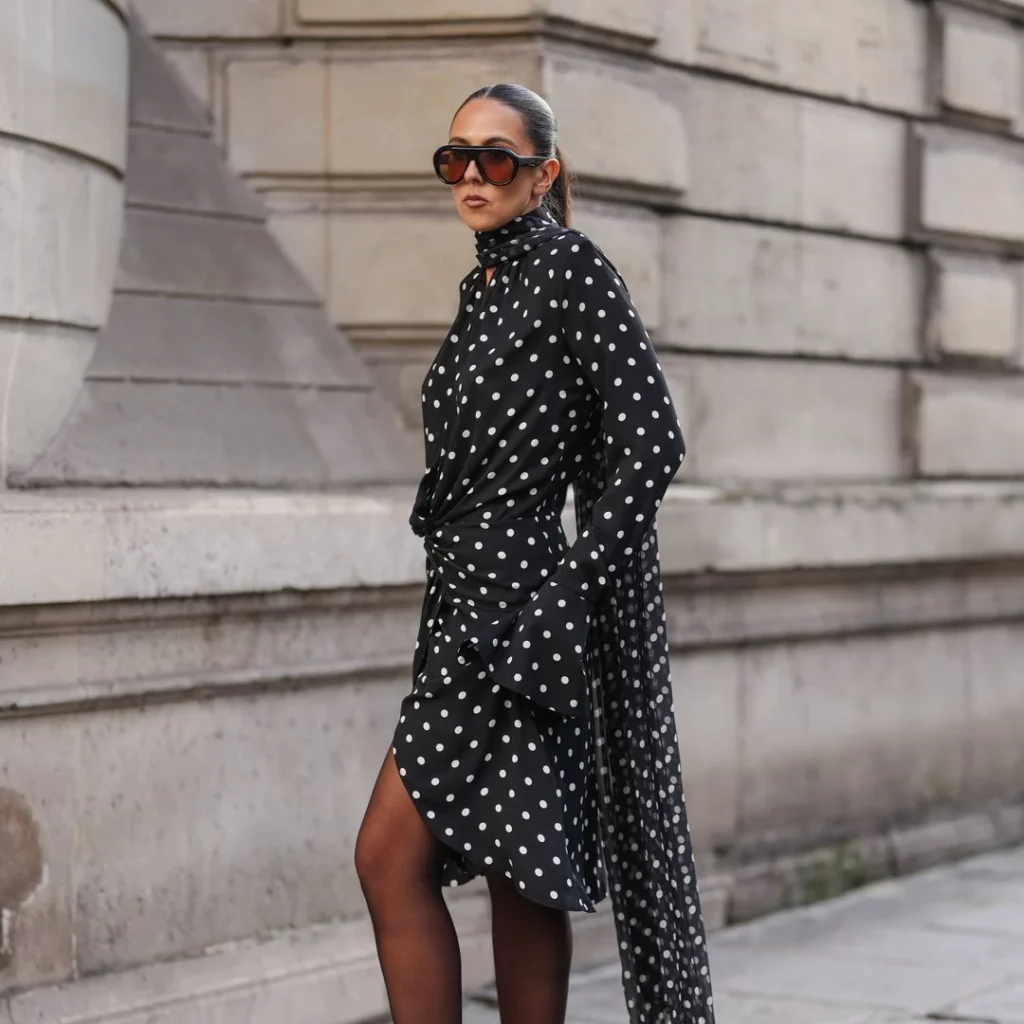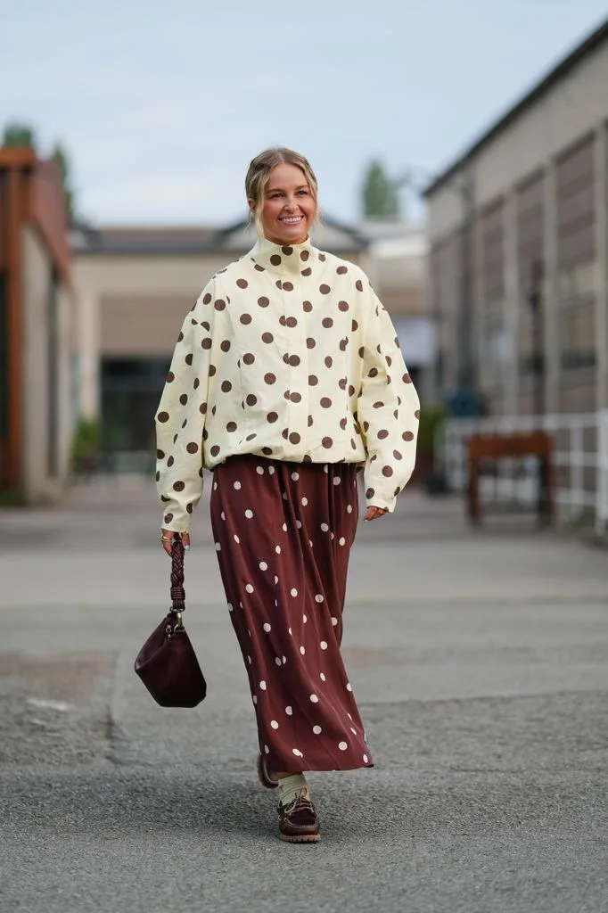 Los polka dots —que dominaron el verano— se reinventan para el frío con un aire más refinado. Aparecen sobre vestidos fluidos, blusas semitransparentes y faldas midi, aportando un toque vintage y femenino. En contraste con tejidos más densos o abrigos estructurados, los lunares añaden dinamismo visual y demuestran que los clásicos pueden transformarse sin perder su esencia.